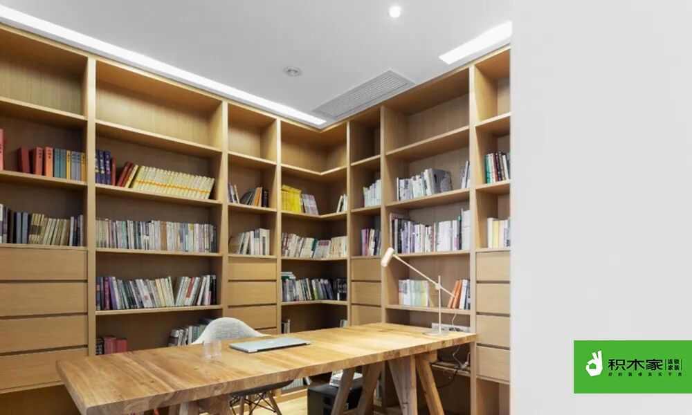 書房是屋主阿無為自己老公特意設計的,整面墻的通頂書柜設計,是使用頻率最高的地方,書柜設計的時候特意預留了存放文件的抽屜以及打印機的專屬位置,針對不同書籍的大小,書柜的間距大小也不相同,整體以原木色的色調為主。